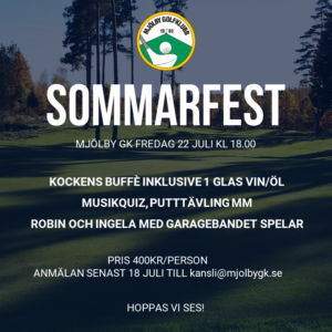 Golfveckan vecka 29 avslutar vi med en sommarfest. Vi ses kl 18 och startar kvällen med kockens goda buffé.Ett glas