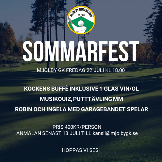 Golfveckan vecka 29 avslutar vi med en sommarfest. Vi ses kl 18 och startar kvällen med kockens goda buffé.Ett glas vin eller öl ingår i priset, övrig dryck tillkommer under kvällen. Eftersom svenska damerna gått vidare i EM och spelar just kl 21 på fredagen anpassar vi självklart kvällen så att vi kan följa matchen…